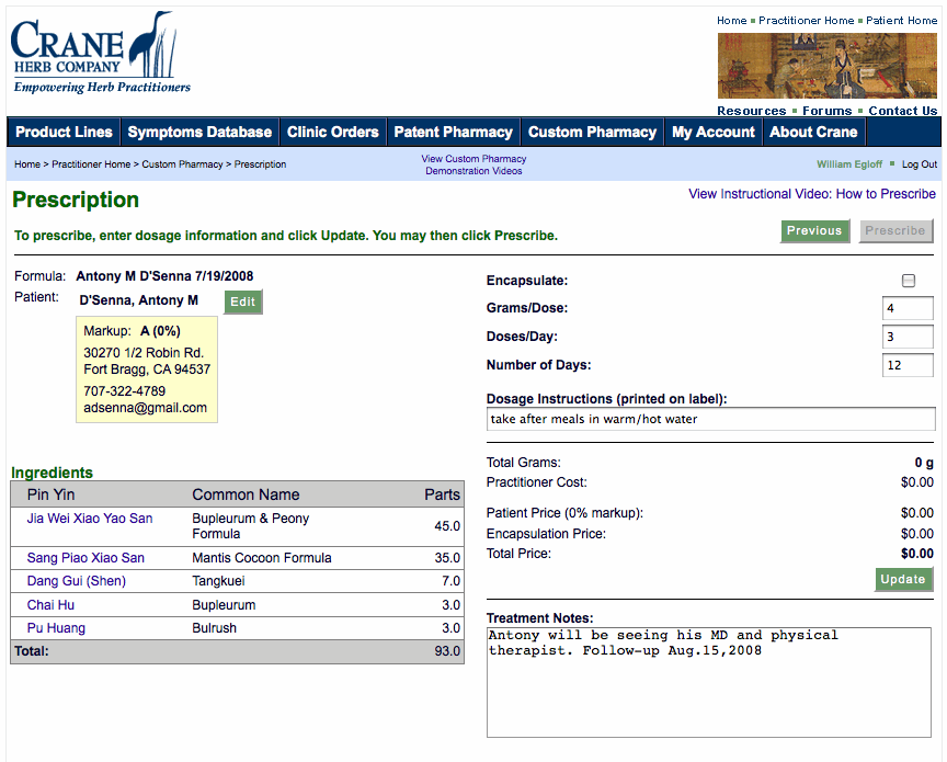 ** Treatment Notes do not print on the Patient’s bottle. You may view or Print the Prescription on the next page (Results). Note that you can get a quote for encapsulating the Prescription with Vegi caps. (0 size cap). Capsule weight and dosage shows on the bottle!