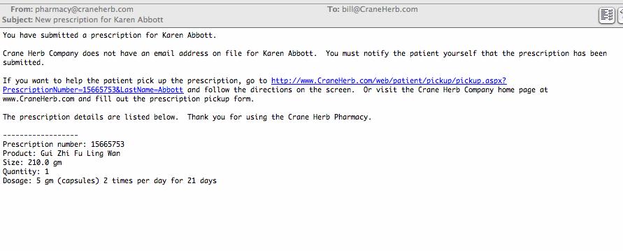 The Practitioner receives an email confirming the Prescription for your Patient. You have the option to pick up the Prescription from this email.