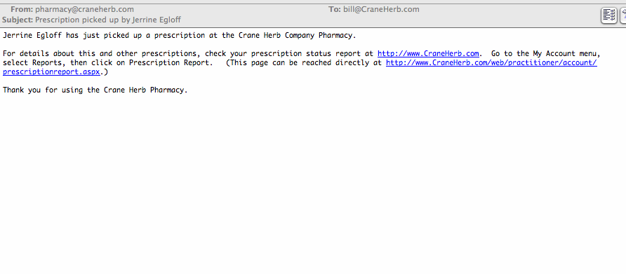 When a Prescription has not been picked up in three days, you and your Patient will receive a Reminder Email. Remember that if your Patient is having trouble getting the email or using the web, you can pick up the Prescription for them, by entering the Prescription number and Patient’s last name on the Crane Herb homepage.