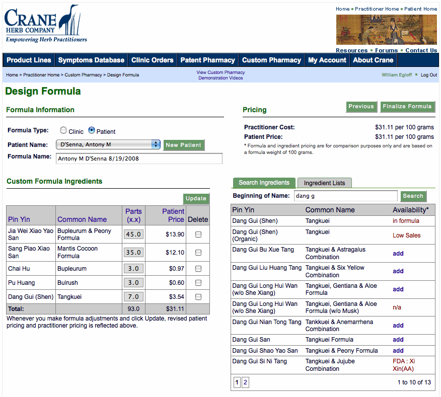 Designing a new Formula is made simple : Combine KPC formulas and add single herbs. Change Parts/% and simply hit Update.