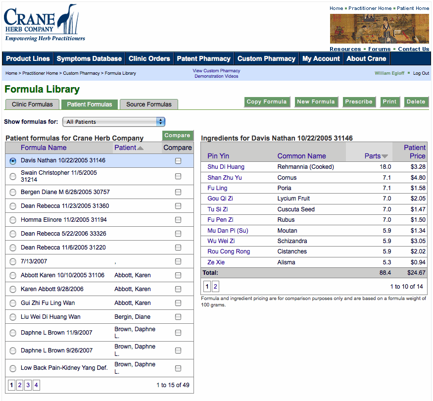 Your Patient Formula Library sorts all formulas by date entered. You can also search formulas by Patient or sort all formulas by Patient’s last name. As you click on the formula on the left, the ingredients are shown on the right.